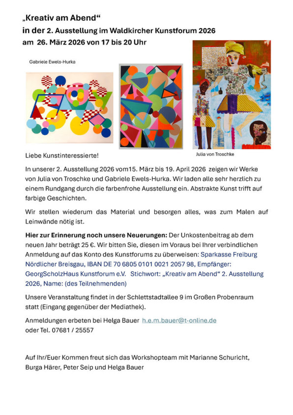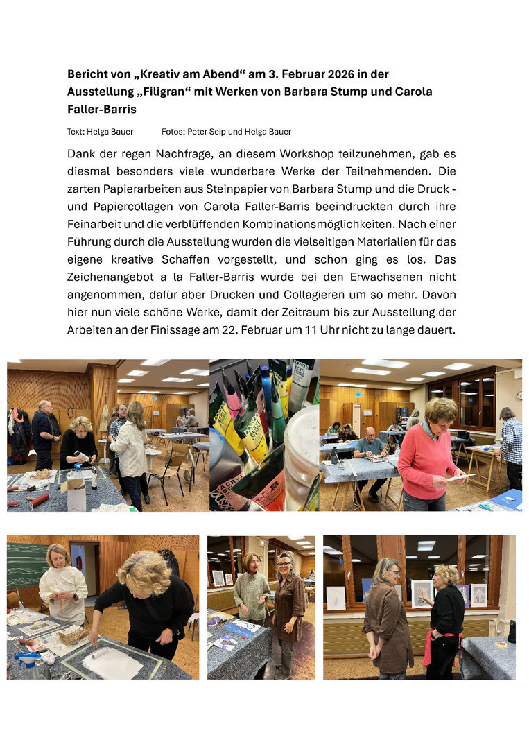 Das neue Jahr 2026 begann mit einer eindrucksvollen Ausstellung im Waldkircher Kunstforum. Barbara Stump und Carola Faller-Barris zeigten ihre Werke. Natürlich fanden wiederum unsere Workshops statt. "Kreativ am Abend" und der Schülerworkshop mit einer dritten Klasse aus Prechtal waren ein voller Erfolg. Es entstanden wunderschöne Werke im Spiegel der Ausstellung.