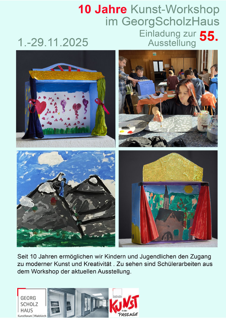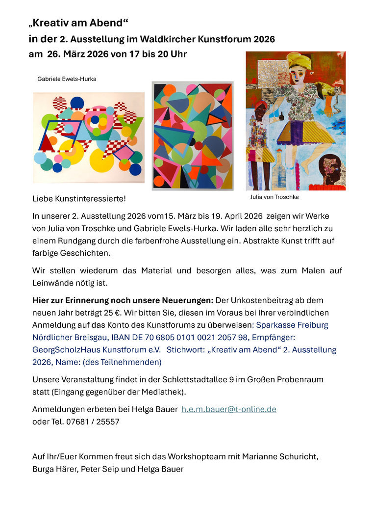 Für 2022 gibt es ein neues Projekt zusätzlich zu dem bewährten Kunstworkshop "Kreativ am Abend" eine neue Reihe mit dem Titel "Kunstwerkstatt", die in den ausstellungsfreien Zeiten im Kunstforum Waldkirch Kurse zu verschiedenen Techniken der Malerei anbieten möchte. Darüber wird demnächst (im Februar 2022) auch auf der Website des GeorgScholzHaus Kunstforums unterrichtet werden. (www.georg-scholz-haus.de)