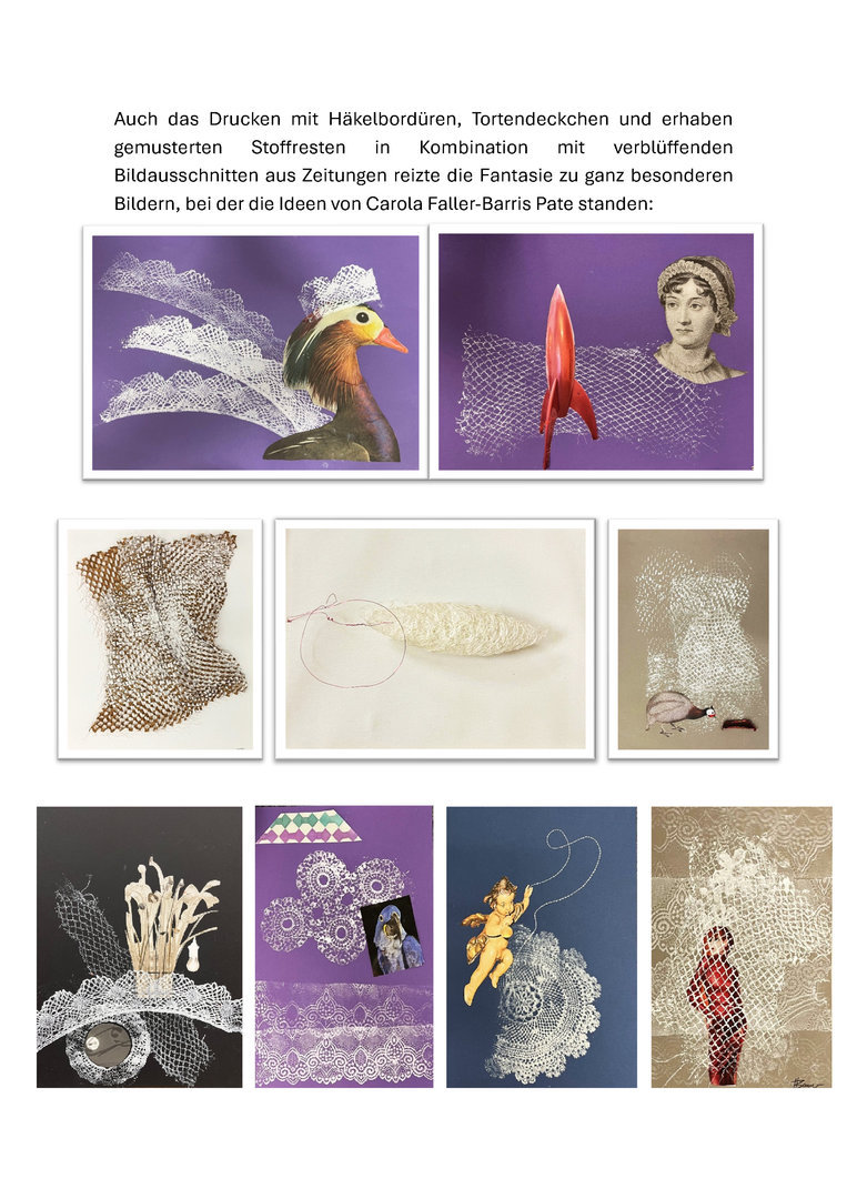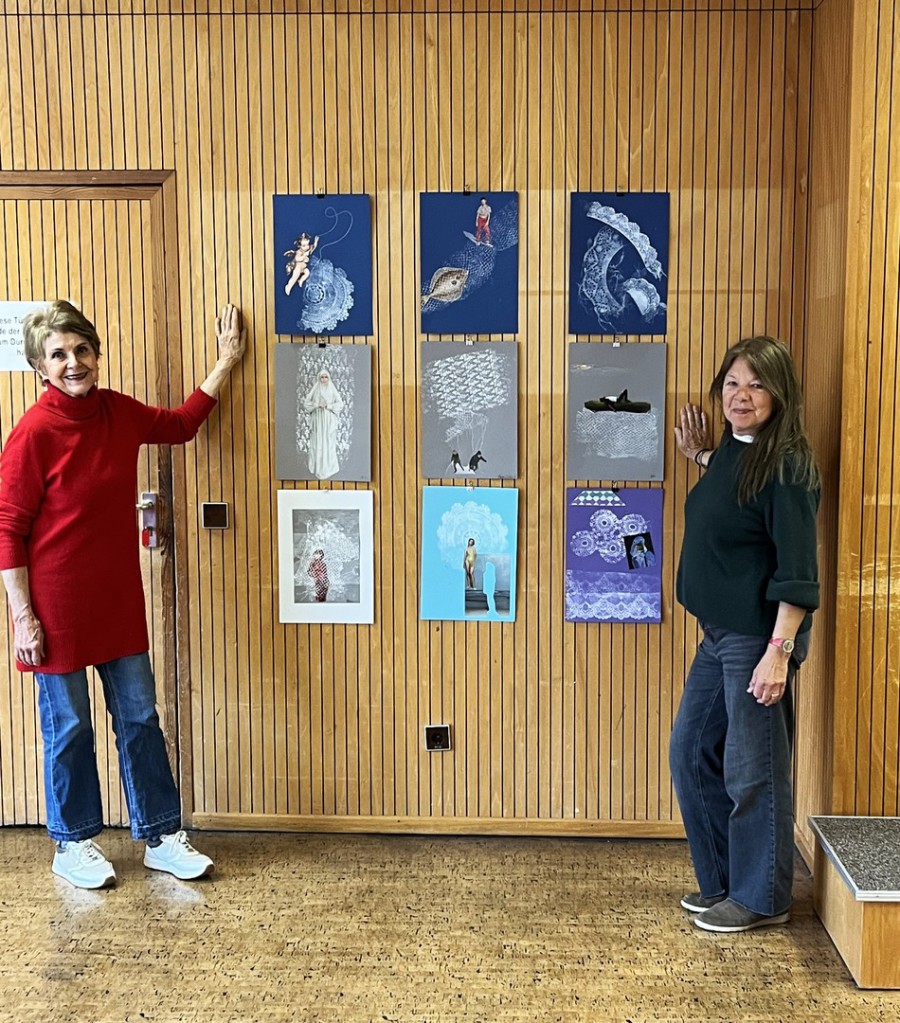 Burga und ich haben grade die collagierten Spitzendrucke aufgehängt.